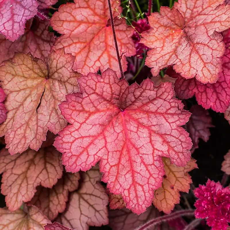 Aussehen: Alaunwurzelpflanze ist niedrigwüchsig, mit dichten Blättern und schlanken Blütenständen. Die Blätter sind meist herzförmig oder rund, haben gezackte Ränder und sind manchmal grün, violett oder braun gefärbt. Der Blütenstand befindet sich normalerweise an der Spitze des Blütenstiels und die Blüten sind klein und dicht. Die Blüten sind meist rosa, weiß oder lavendelfarben.
