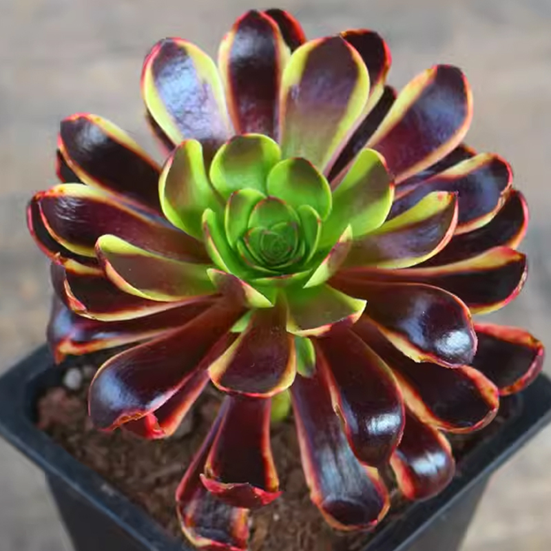Die Baumartige Aeonie bildet eine dichte Rosette aus fleischigen, glänzenden Blättern, die aufrecht auf einem langen Stiel wachsen. Die Blätter sind meist lanzettlich und können eine Vielzahl von Farben aufweisen, darunter Grün, Rot, Lila und Bronze. Unter idealen Bedingungen kann die Baumartige Aeonie bis zu einem Meter hoch werden und bildet dabei einen beeindruckenden Stamm.