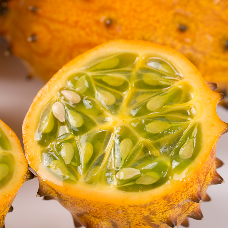 🟠Die Feuer-Ginseng-Frucht ist die gehörnte Melone, die aus der Kalahari-Wüste in Afrika stammt. Das Fruchtfleisch der Stachelmelone ist zart und mehrkernig. Es ist glibberig wie eine Gurke und hat einen süßen Geschmack, der nach einer Mischung aus Banane, Zitrone und Gurke schmeckt.